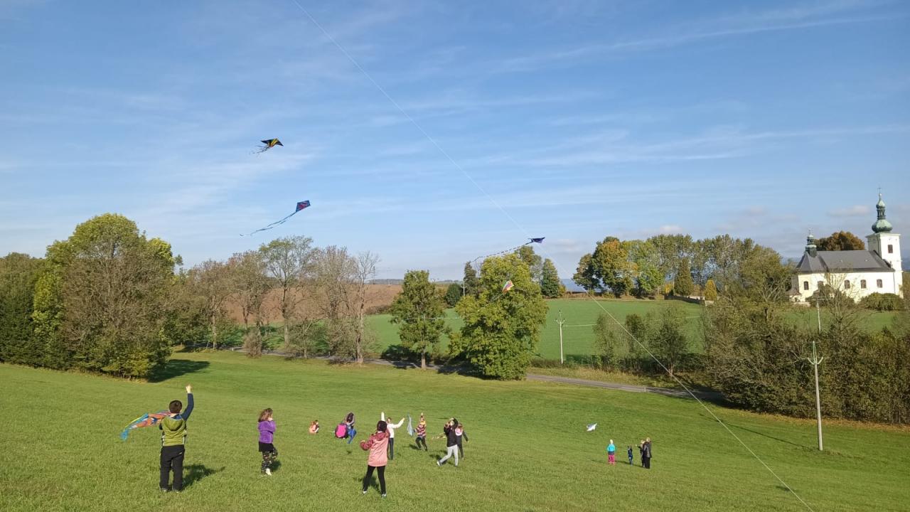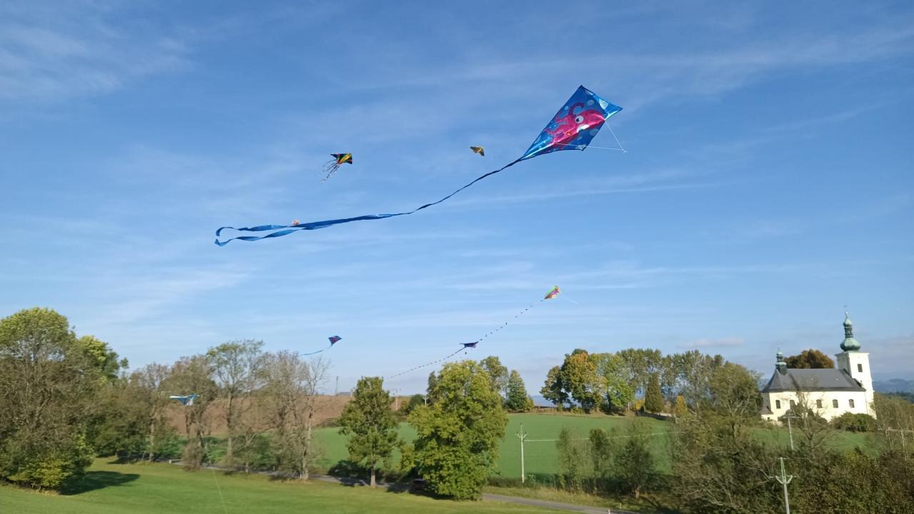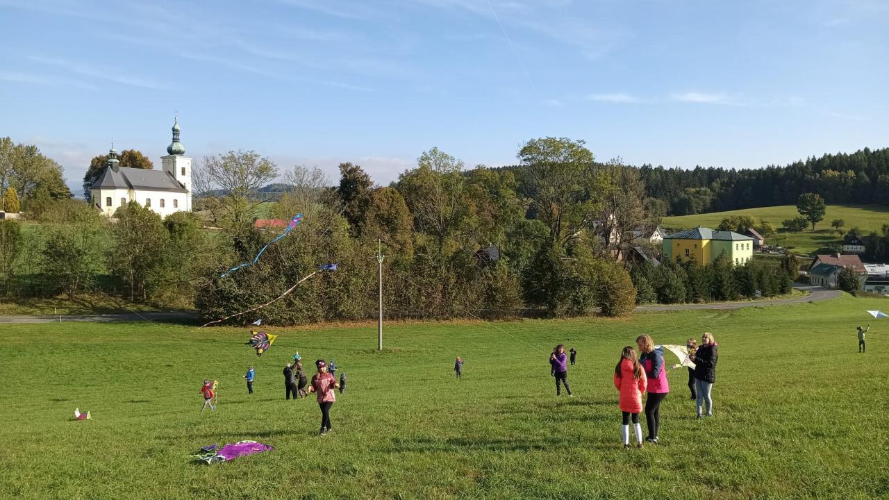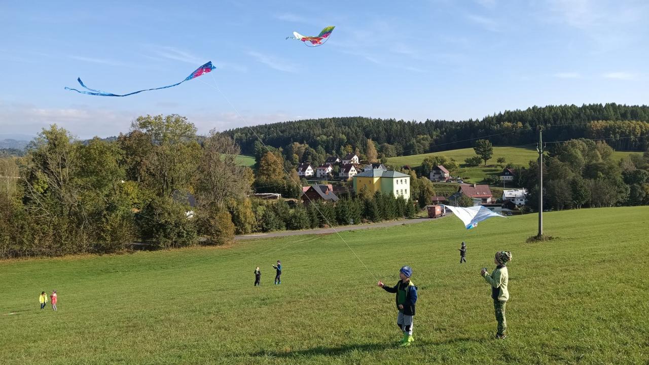 Dnešní drakiáda Vítr nám přál a draci se vznášeli vysoko